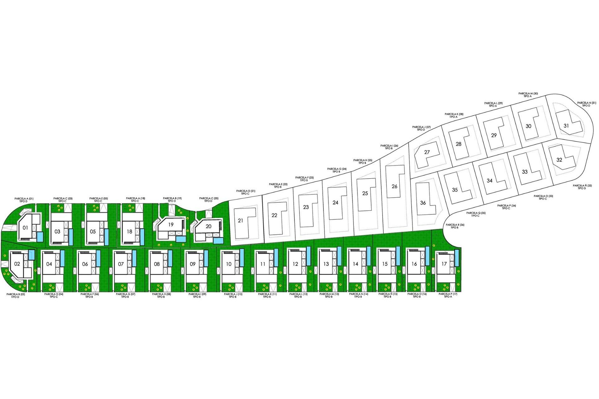 På bottenvåningen finns ytterligare ett eller två sovrum med egna badrum, en gästtoalett och ett öppet kök som är anslutet till vardagsrummet och matsalen, med direkt tillgång till terrassen och poolen. Varje fastighet har ett solarium på taket med panoramautsikt över bergen eller havet och möjlighet att installera en jacuzzi.